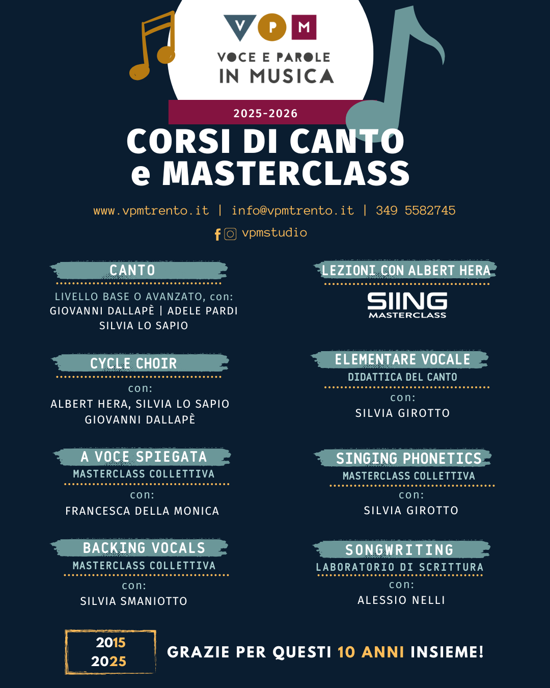 Immerso nel verde, sulla collina est di Trento, dal 2015 c’è lo studio VPM che mette al centro della propria attività la voce, le parole e la musica cercando di offrire ai propri allievi gli strumenti per esprimersi attraverso il canto e la musica. Lo studio offre corsi di formazione rivolti a cantanti, cantautori e musicisti che vogliono iniziare ad approcciarsi ad un percorso artistico e musicale o migliorare e perfezionare un percorso già avviato.